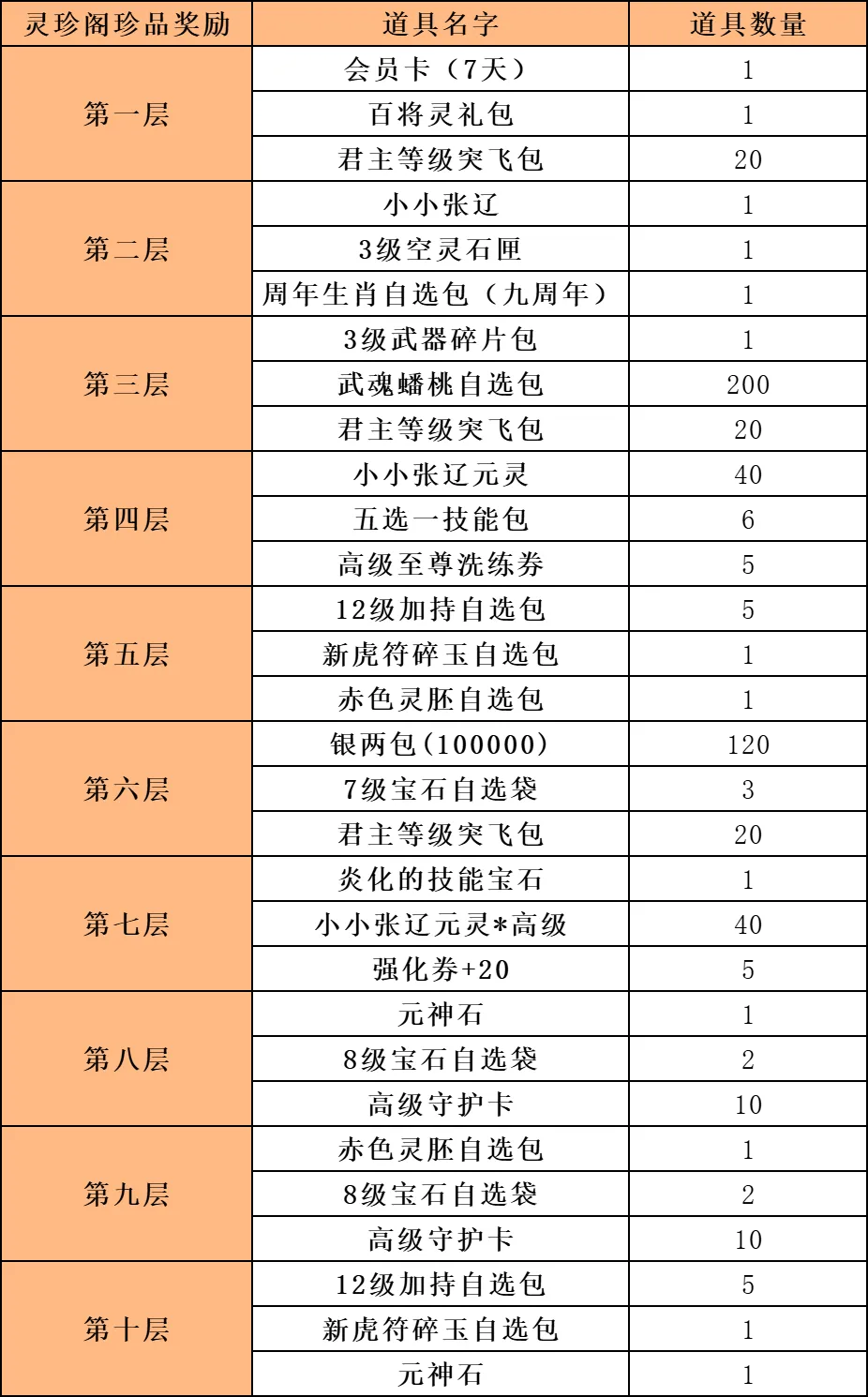 规则说明:每层设有3个珍藏道具,集齐全部道具后即可进入下一层。本次灵珍阁总层数已由原先的5层扩展至10层。其中,1-5层视为第一轮,第6层起进入第二轮。