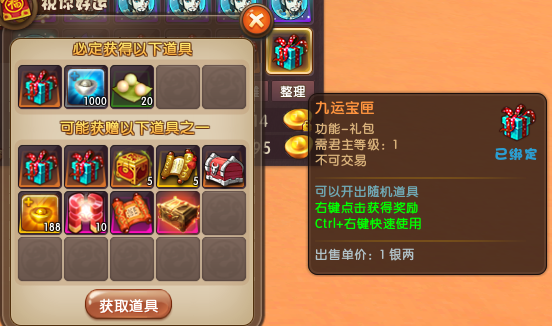 开启【九运宝匣】后必得【百将灵礼包*1、银两*1000、武魂丹*20】,还有机会获得【周年生肖自选包、人皇地灵包、强化券+15、5级宝石袋、武器碎片福利包等】。