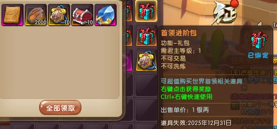 ②首领直购进阶礼包(988元宝),购买该礼包可获得2000首领印记和世界首领挑战令*10!详细礼包内容如下: